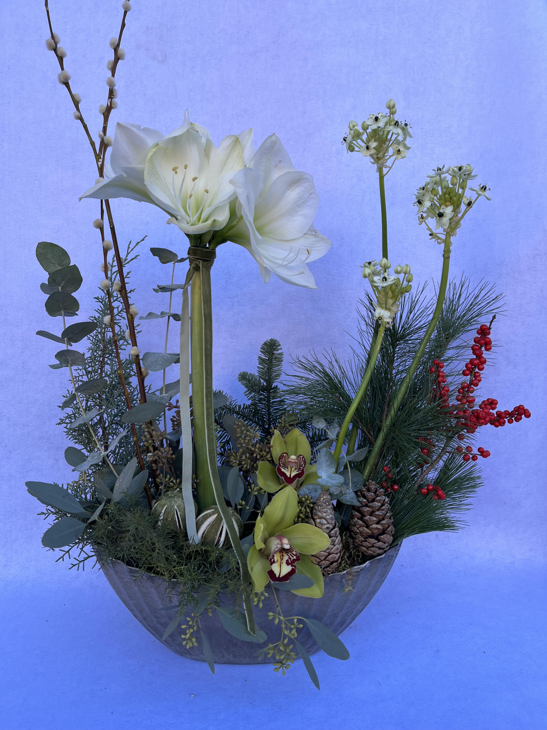 A modern winter sculpture of white amaryllis and exotic orchids rising through tailored evergreens, textured cones and red berry accents — a ready botanical statement.