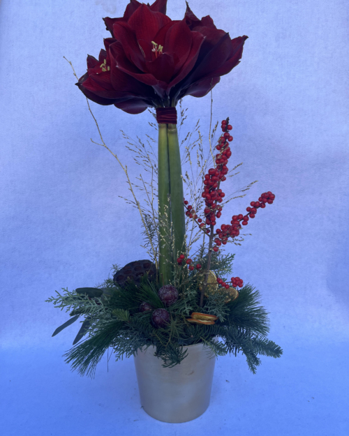 £55.00A towering crimson amaryllis paired with winter foliage, red berries pine cones and dried citrus, set in a “gold” container for a warm, glowing Christmas centrepiece.
